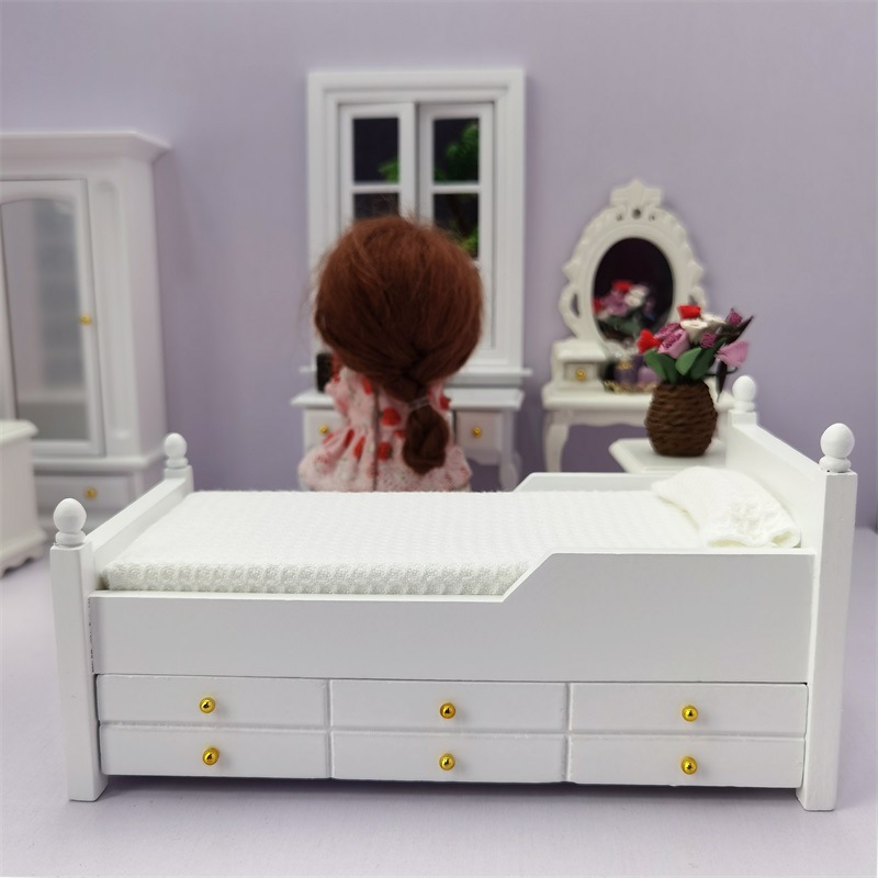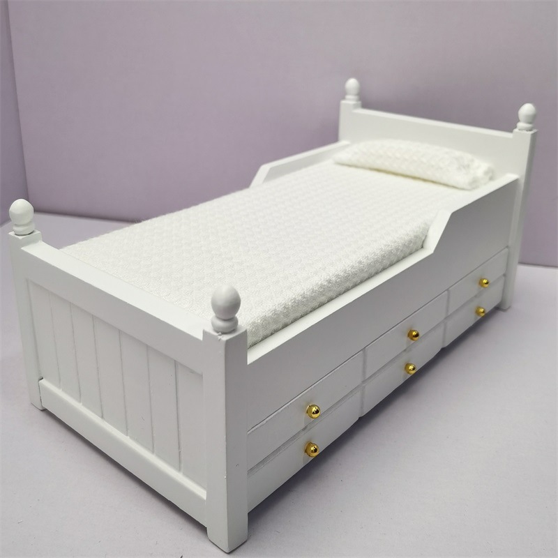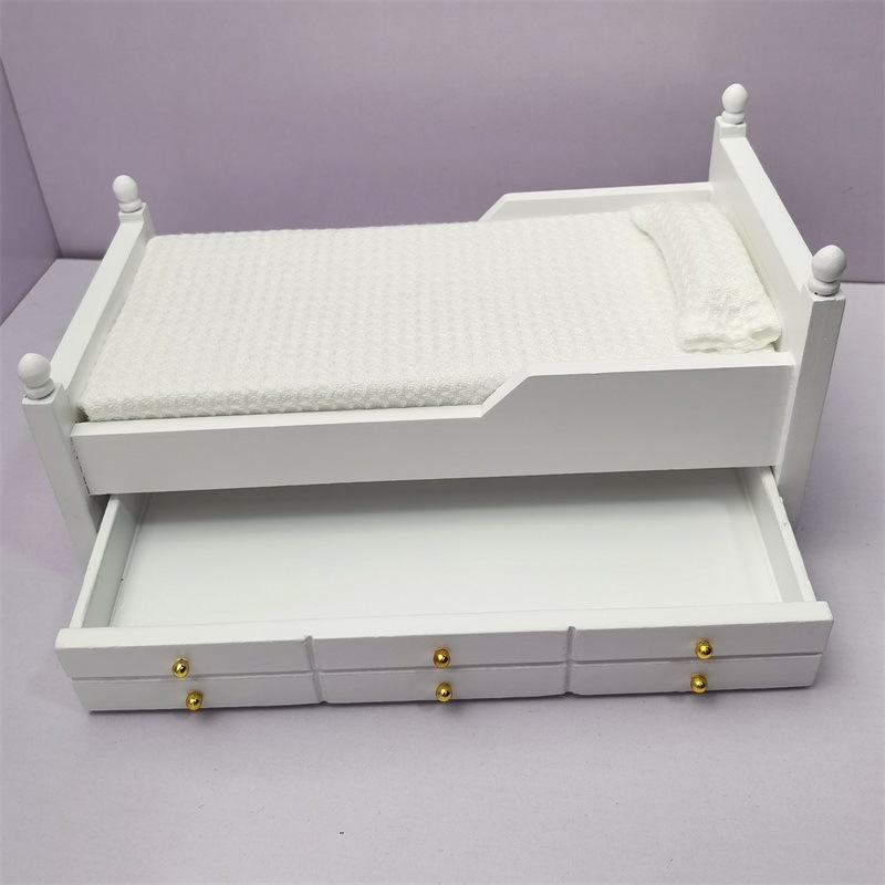 Кроватка с выдвижным ящиком белого цвета для кукол. Масштаб 1:12