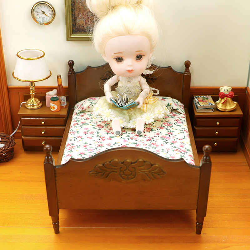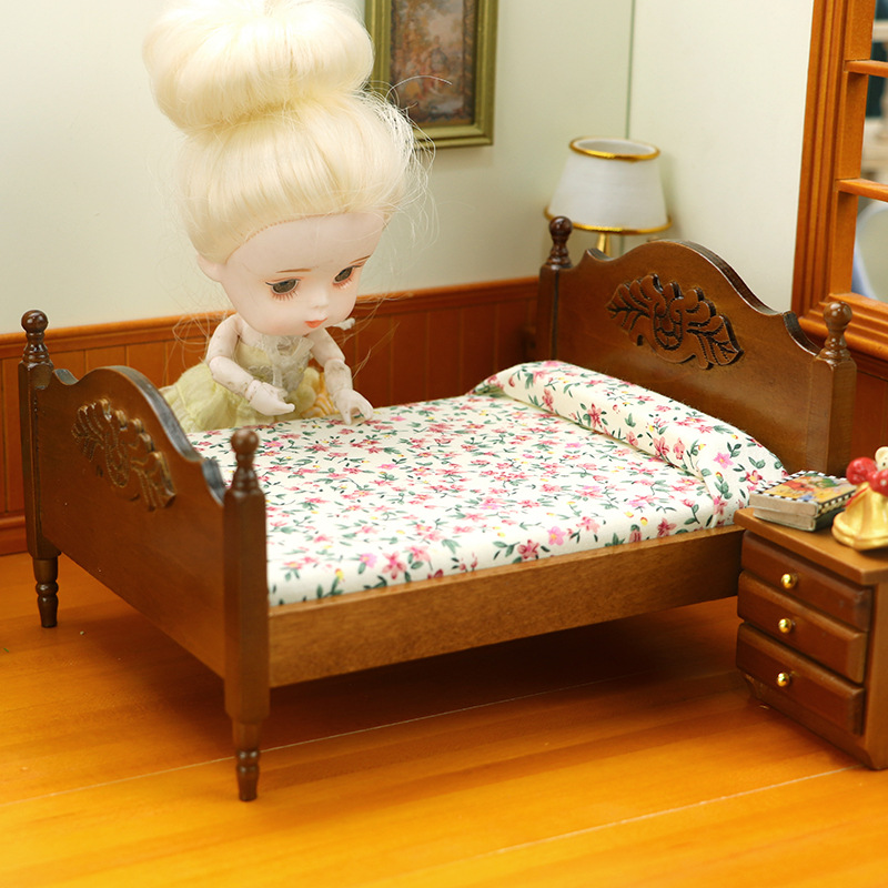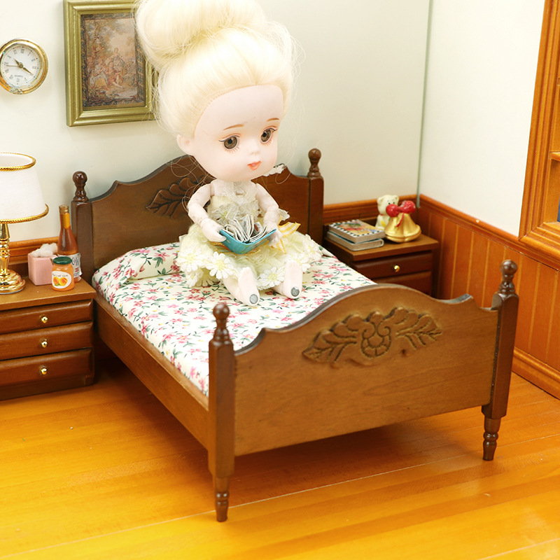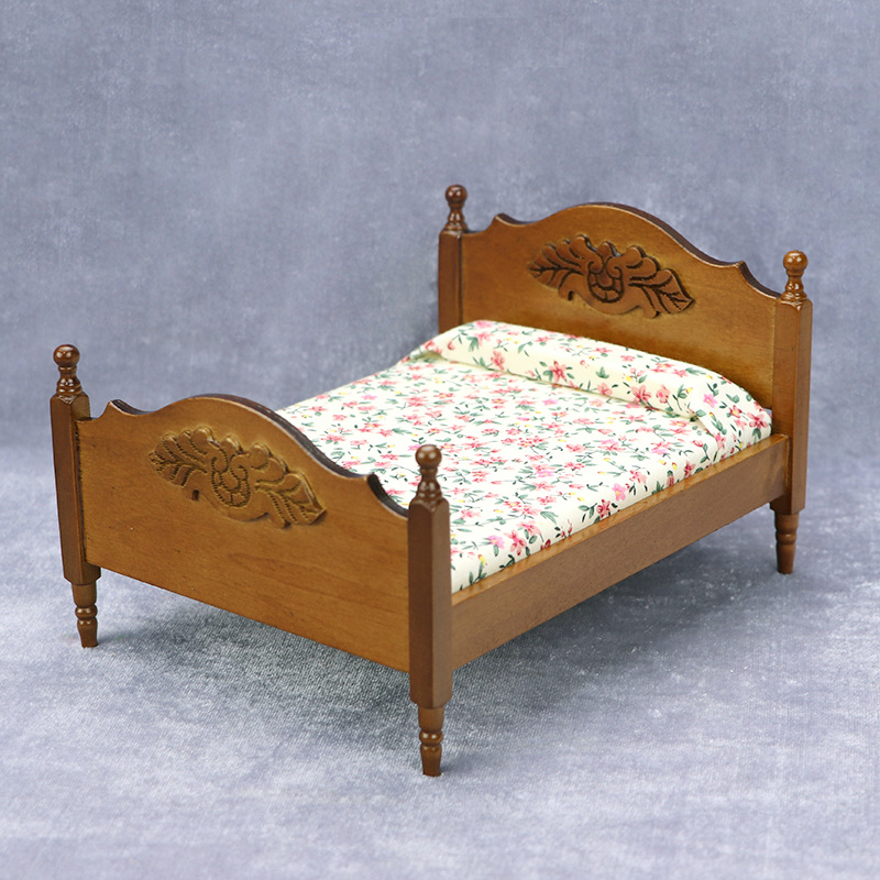 Кроватка для кукол в цвете орех с резными узорами. Масштаб 1:12