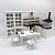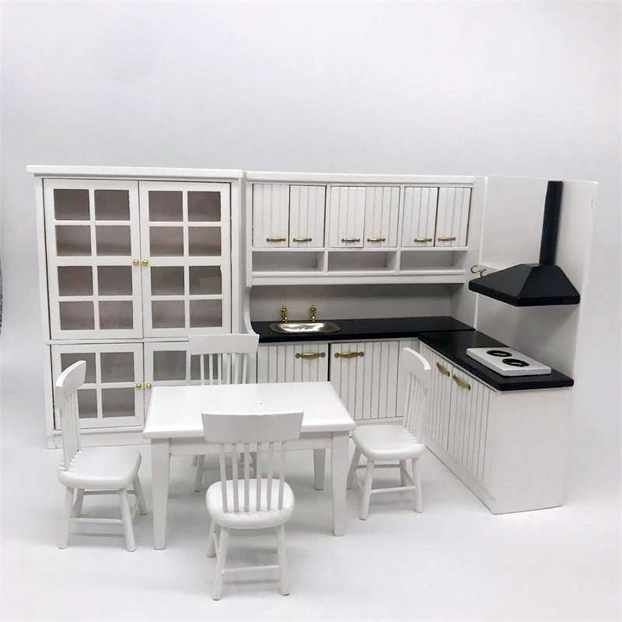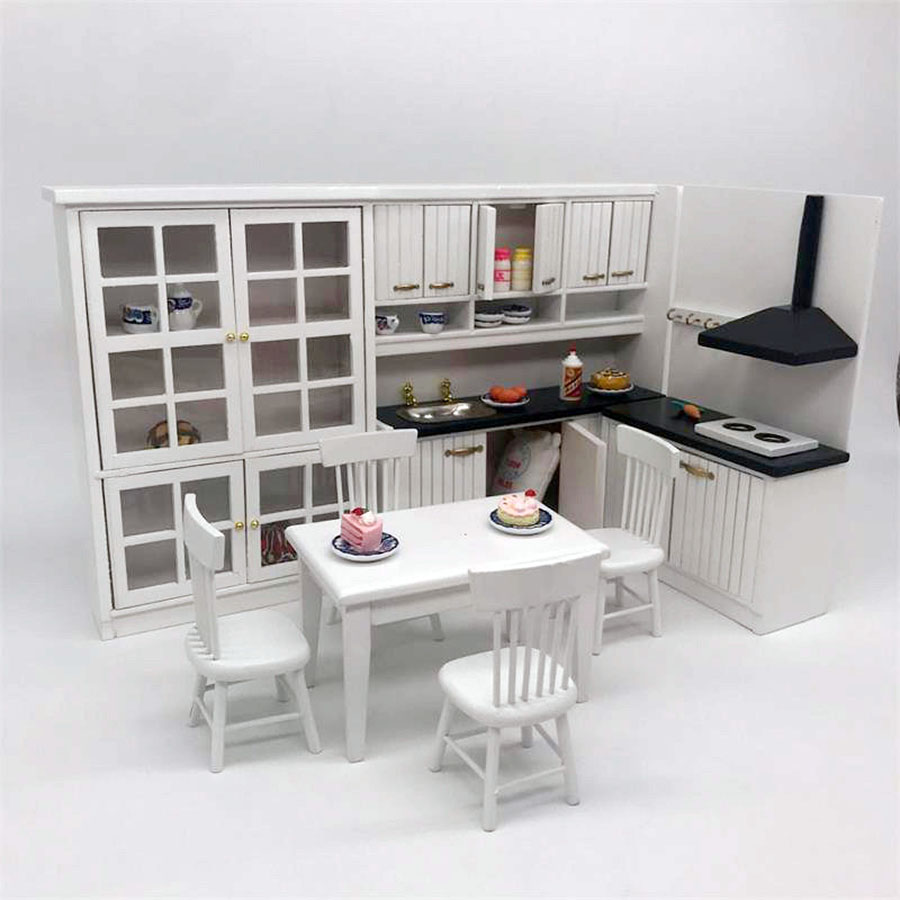 Миниатюрный белый кухонный гарнитур для кукол с обеденной зоной, состоит из трех модулей: его можно располагать углом, по прямой или модульно.