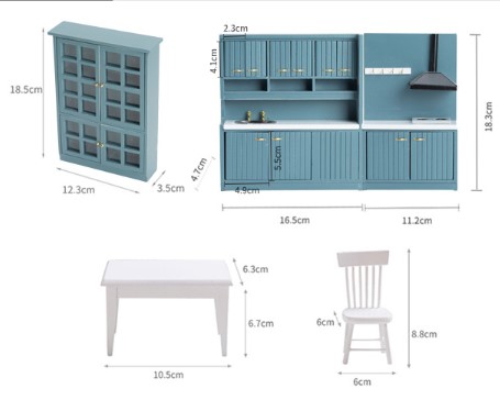 Миниатюрная деревянная кухня для кукол актуального дымчатого цвета. Гарнитур кухонный состоит из двух частей (можно сделать угловой вариант) - с раковиной, плитой и вытяжкой, есть крючки для повесов кухонной утвари, дверцы открываются. Просторный посудный шкаф и обеденная зона (стол и 4 стула) входят в комплект. Такая миниатюрная мебель подойдет для оформления кукольного домика или румбокса в масштабе 1:12