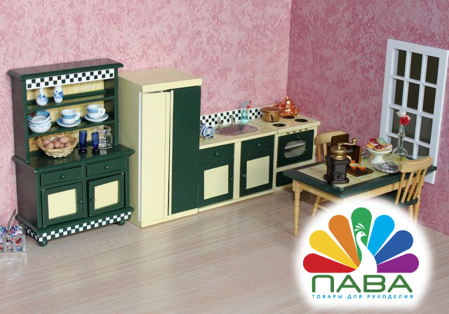 Миниатюрный кухонный гарнитур для кукол с обеденной зоной. Удобен тем, что отдельные модули можно располагать так, как позволяет это делать пространство кукольной кухни. Мебель предназначена для оформления кукольного домика или тематического румбокса в масштабе 1:12.