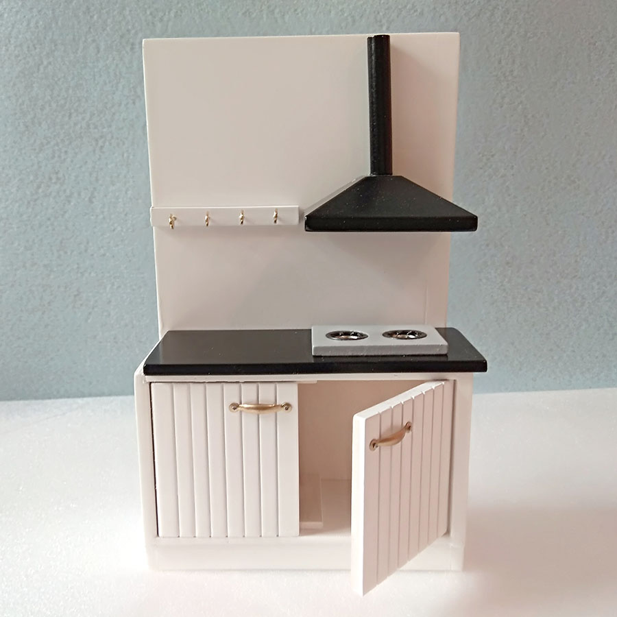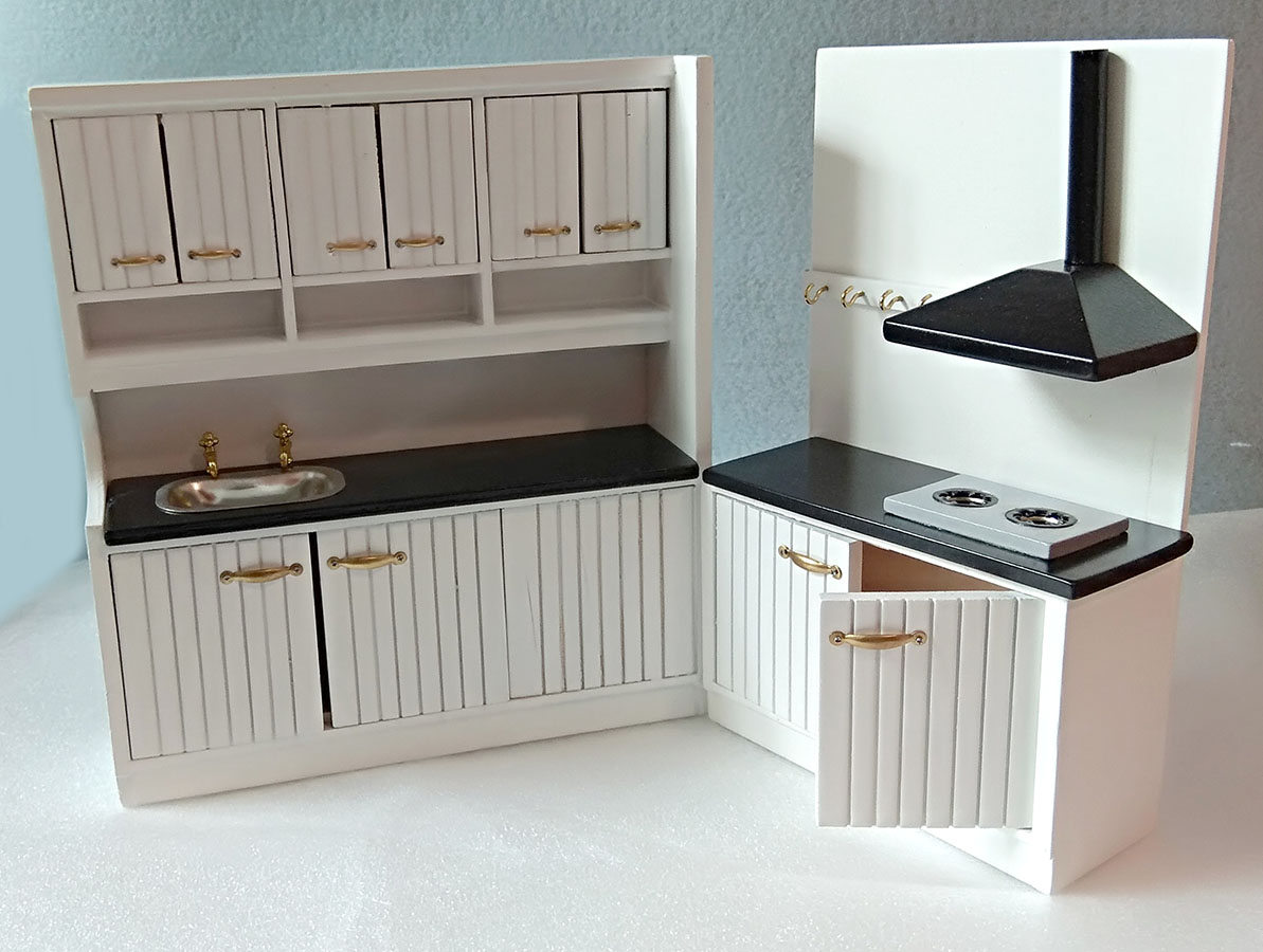 Миниатюрный белый кухонный гарнитур для кукол состоит из двух модулей, его можно располагать углом, а также возможен вариант - по прямой линии или модульно.