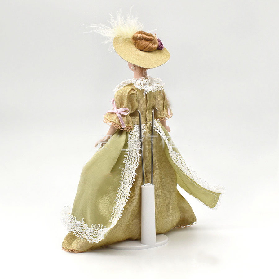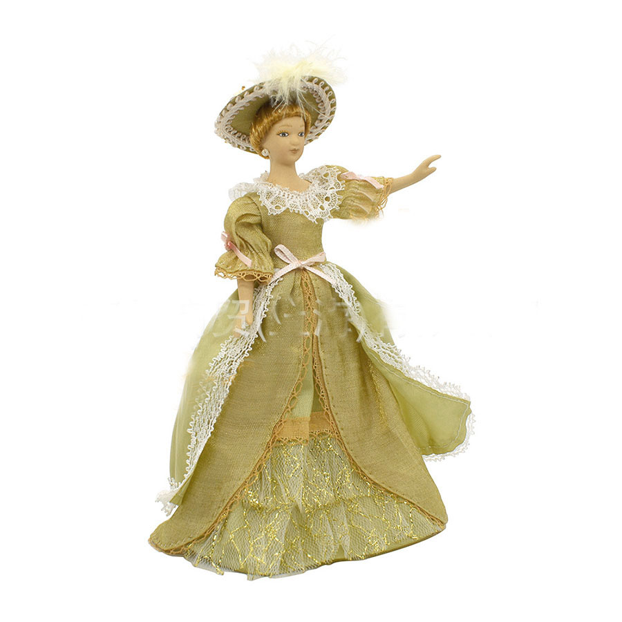 Миниатюрные куколки для домиков и румбоксов в масштабе 1:12. Благородная дама в элегантном бежевом платье с кружевной отделкой, с нежно-оливковой  юбкой и в нарядной шляпе с пером.