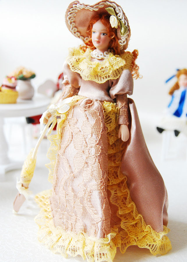 Кукла Дама в бежевом с зонтиком Миниатюра 1:12