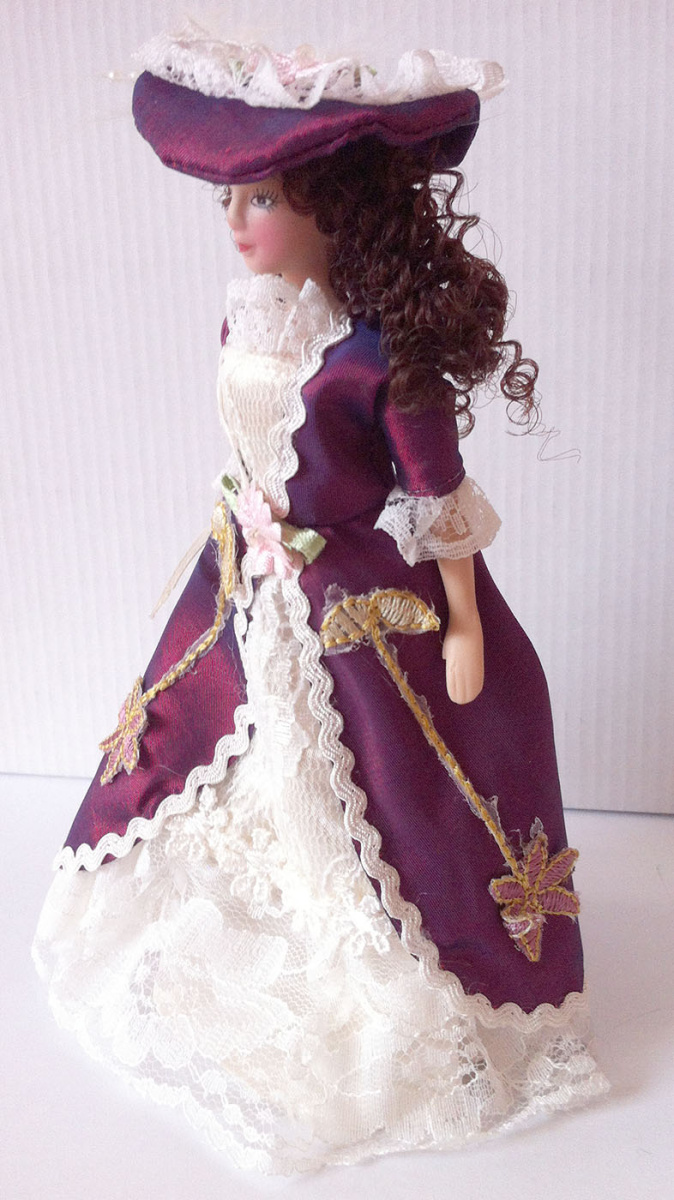 Миниатюрные куколки для домиков и румбоксов в масштабе 1:12. Благородная дама в элегантном бордовом платье с кружевной отделкой и в нарядной шляпе.