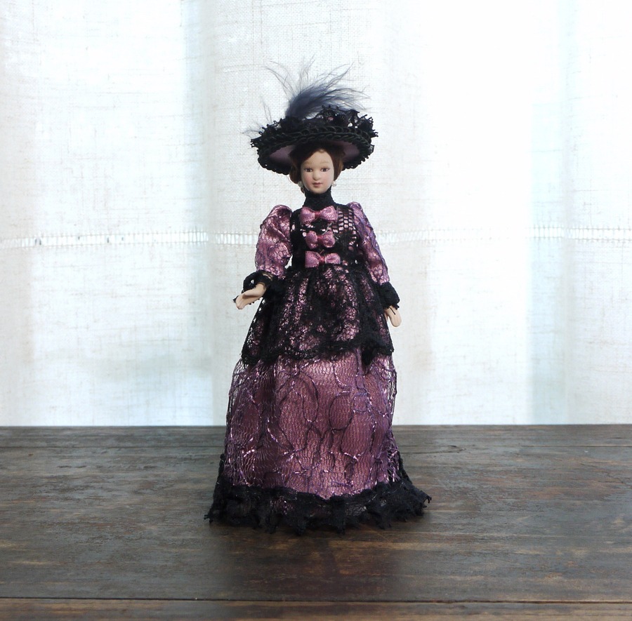 Миниатюрные куколки для домиков и румбоксов в масштабе 1:12. Благородная дама в элегантном лиловом платье с кружевной отделкой и в нарядной шляпе.