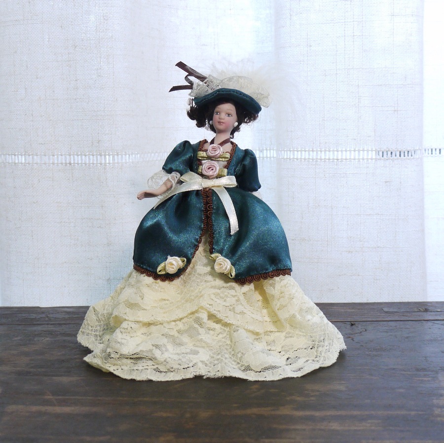 Миниатюрные куколки для домиков и румбоксов в масштабе 1:12. Благородная дама в темно-зеленом платье с нежно-желтым кружевом и в нарядной шляпке.