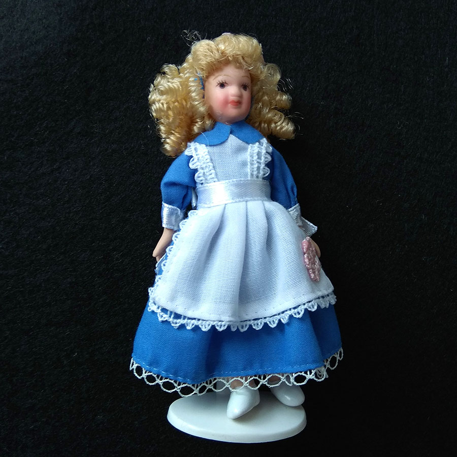 Кукла Девочка в синем платье с фартуком Миниатюра 1:12   - фото товара