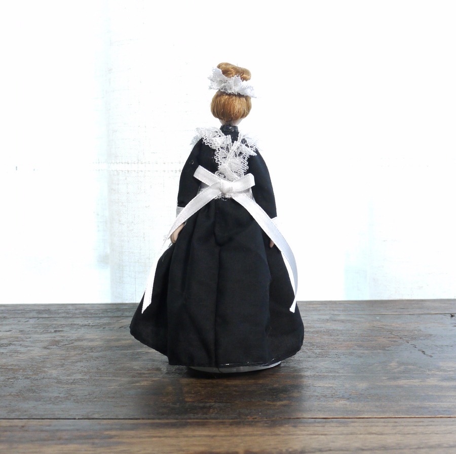 Миниатюрные куколки в разных костюмах для домиков и румбоксов в масштабе 1:12. Кукла горничная в чёрном платье и белом фартуке.