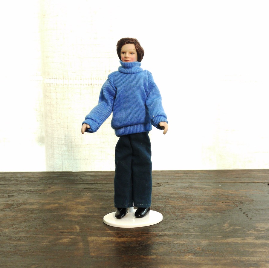 Миниатюрные куколки в разных нарядах для домиков и румбоксов в масштабе 1:12. Кукла мужчина в синем свитере.