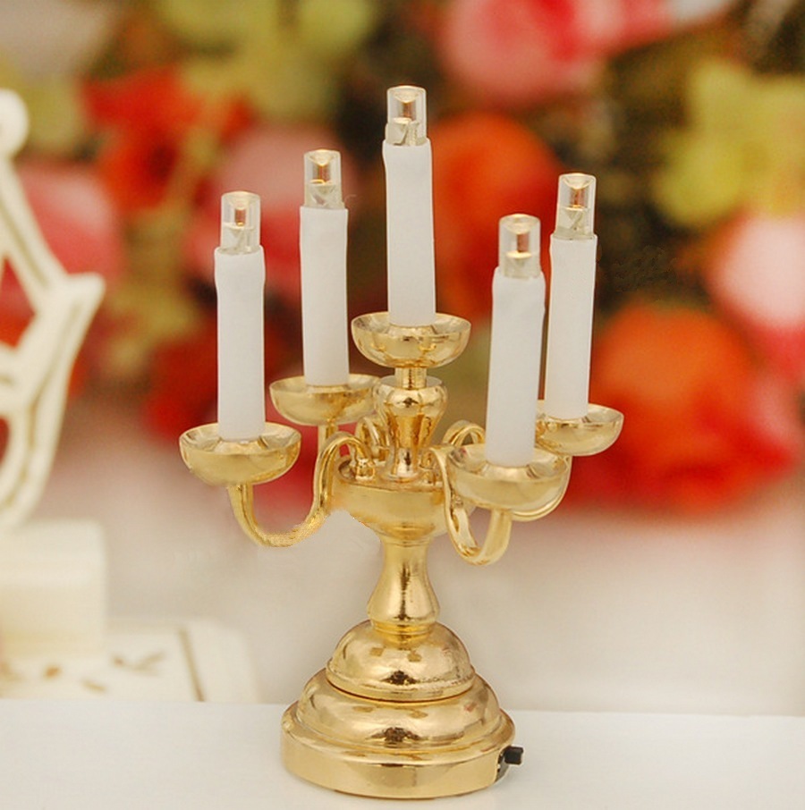 Канделябр на 5 свечей/лампочек LED. Миниатюрный светильник - с проводом и вилкой - включается в специальную кукольную розетку. В нашем магазине можно также приобрести такую розетку (с одним гнездом) на батарейке или удлинитель (на 6 гнезд), который включается в обычную электросеть.