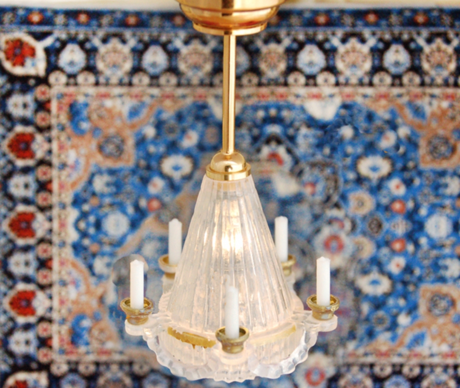 Люстра для кукол с 5 подсвечниками (стекло, пластик, металл под золото). Подойдет для кукольной гостиной в домик или румбокс масштабом 1:12