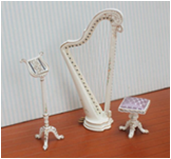 Миниатюра для кукол Арфа со стульчиком и пюпитром Белая