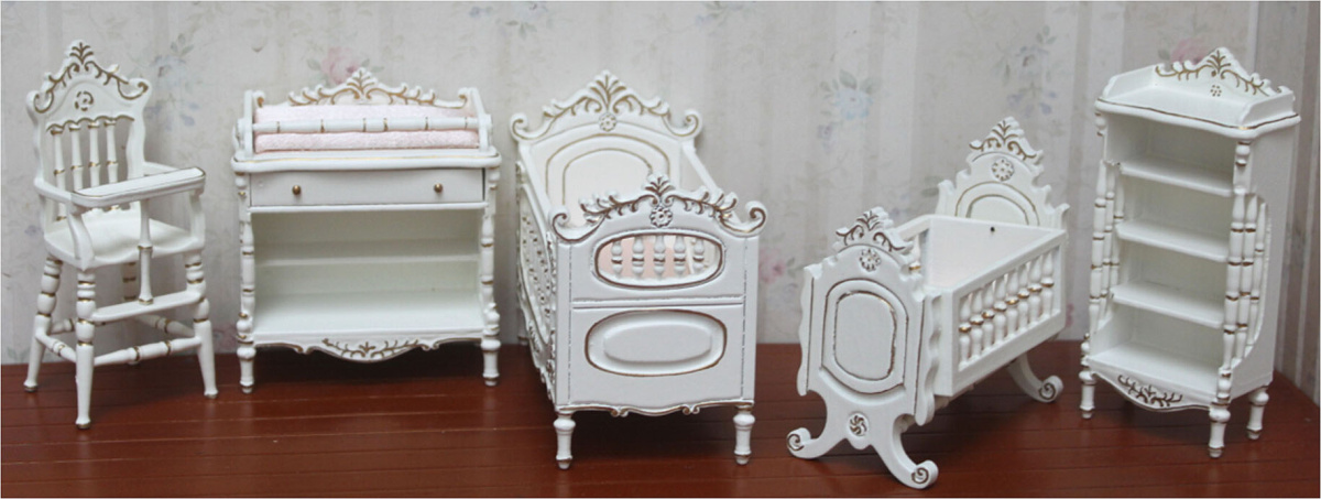 Миниатюрная деревянная мебель для кукольной детской комнаты или тематического румбокса. Мебель украшена резьбой, ручной росписью и позолотой. Миниатюра 1:12 для оформления кукольного домика или румбокса