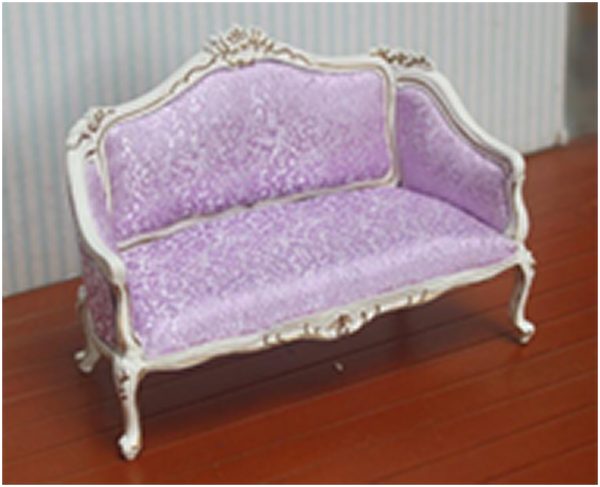 Элегантный двухместный диванчик с сиреневой обивкой для кукольной гостиной. Мягкая мебель для оформления румбокса или кукольного дома масштабом 1:12.
