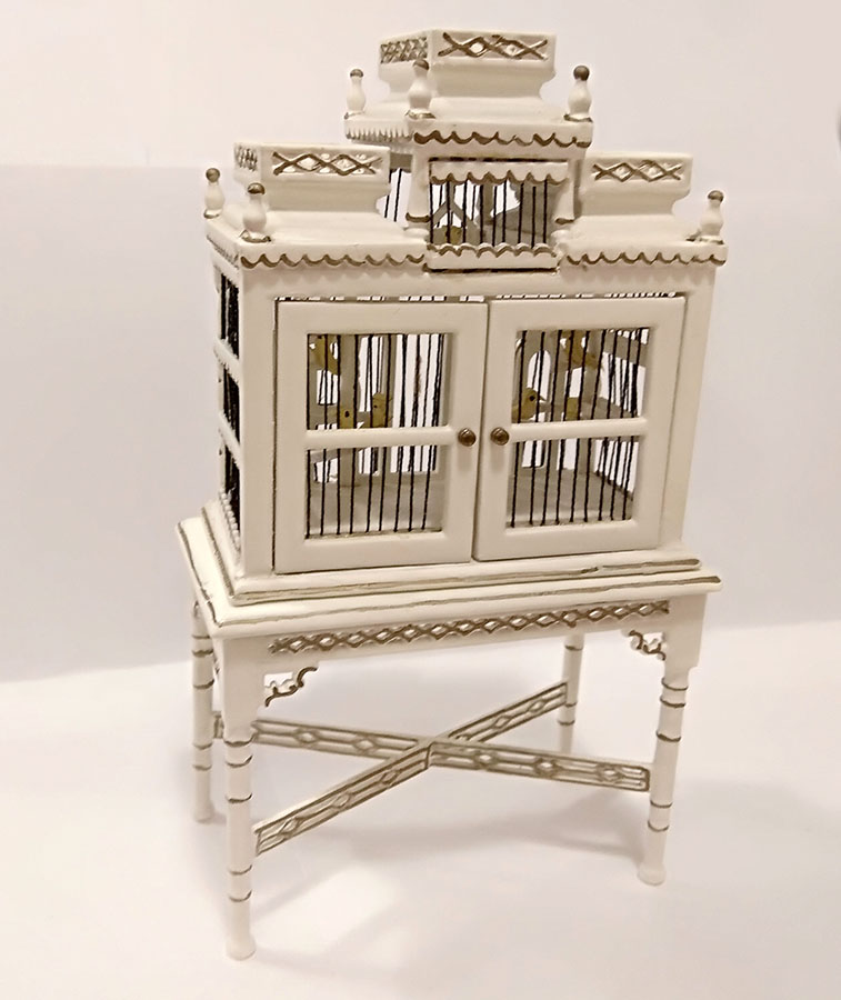 Клетка для птиц на столике-подставке для оформления тематических румбоксов или кукольных домиков. Миниатюрная мебель выполнена из дерева, окрашена белой краской с элементами золочения.