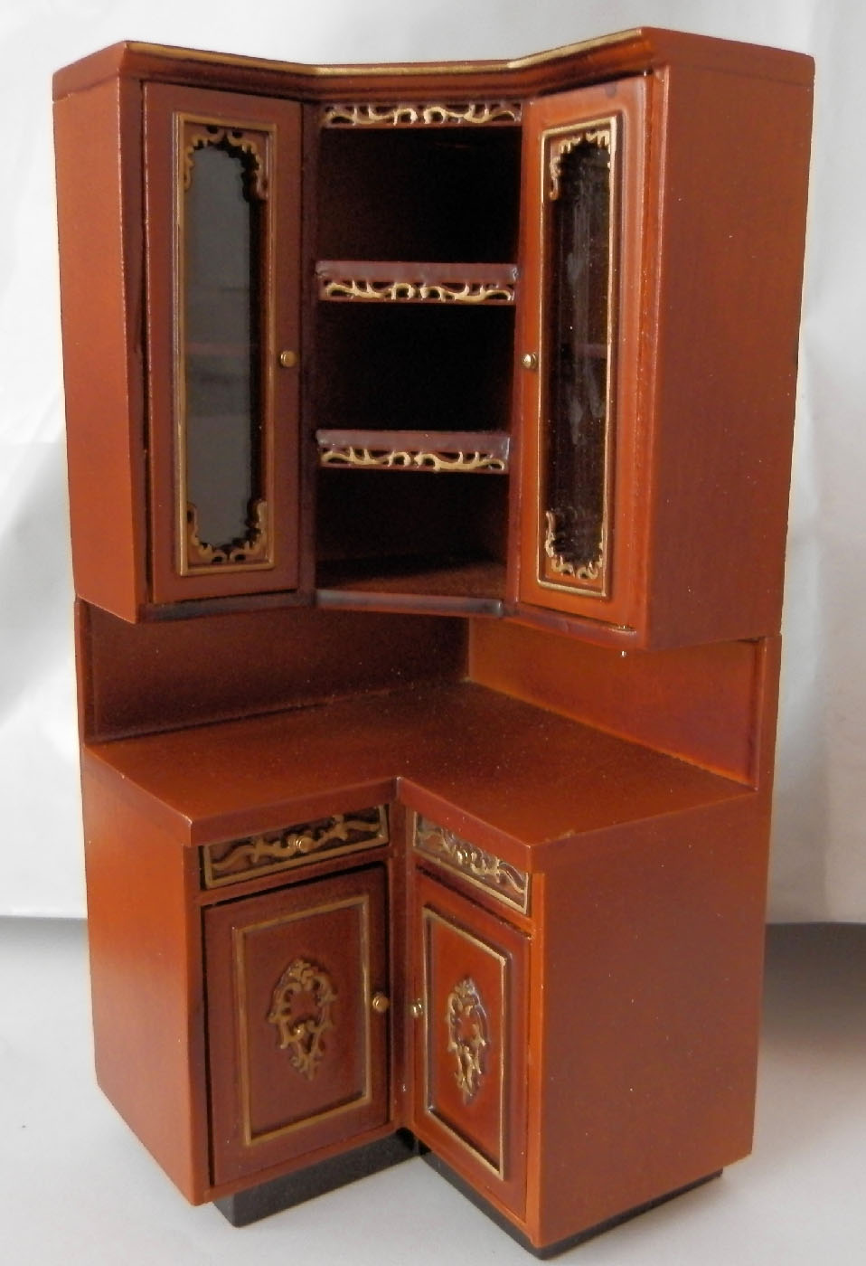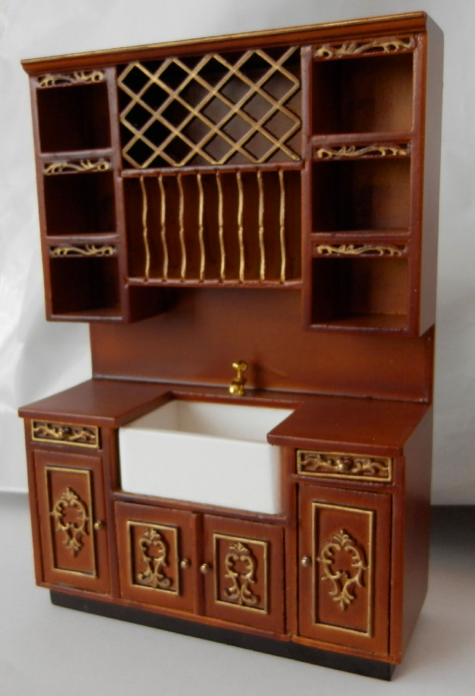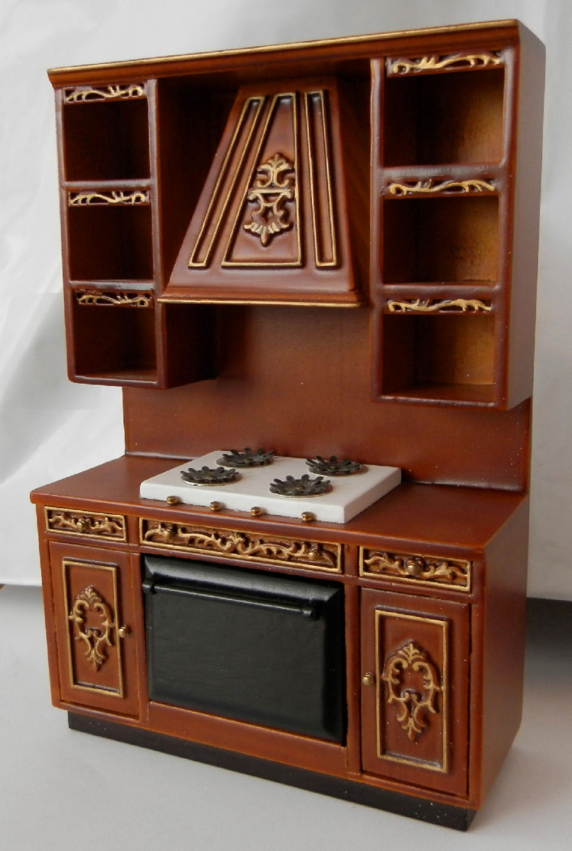 Роскошный кухонный гарнитур для кукол цвета jht[ с золоченой резьбой. Состоит из пяти модулей (один из них угловой) и островка. Встроенный холодильник, плита, вытяжка, раковина, множество декоративных и функциональных полок - всё, что необходимо на большой кухне.