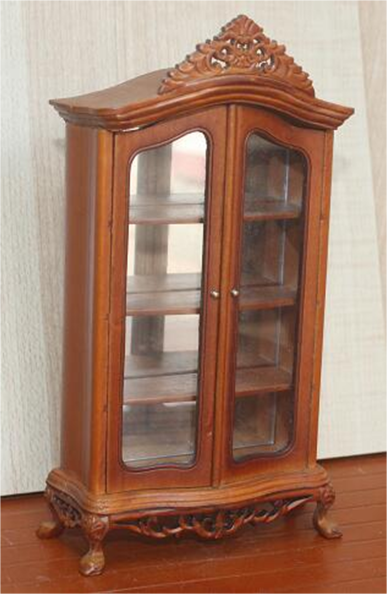 Шкаф для кукол  из натурального дерева с резьбой ручной работы. Дверцы стеклянные, задняя внутренняя стенка зеркальная.