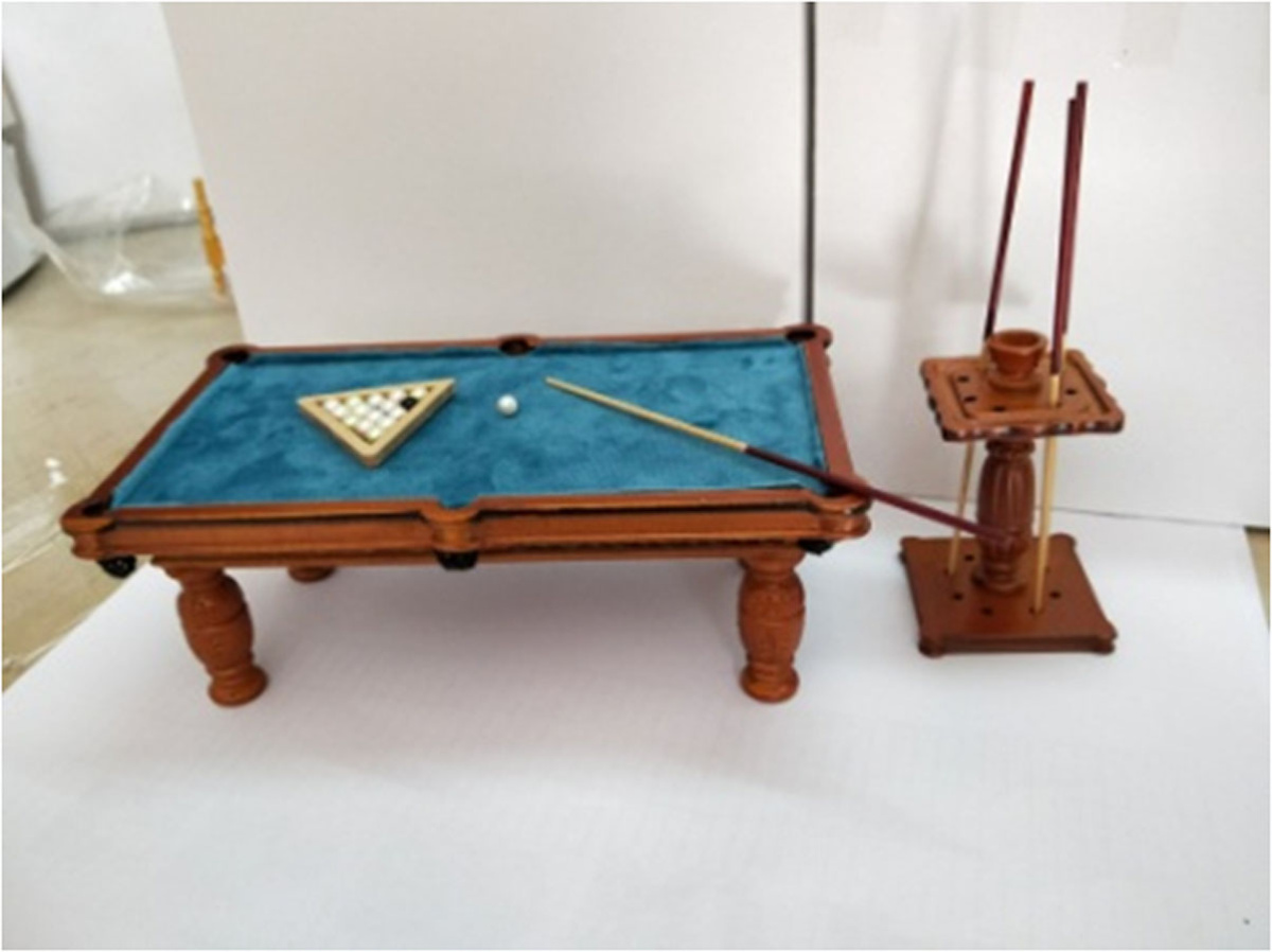 Стол бильярдный выполнен из дерева, цвет орех, столешница отделана бархатом. Такая деревянная мебель с богатой отделкой подойдет для оформления румбокса или кукольного домика.