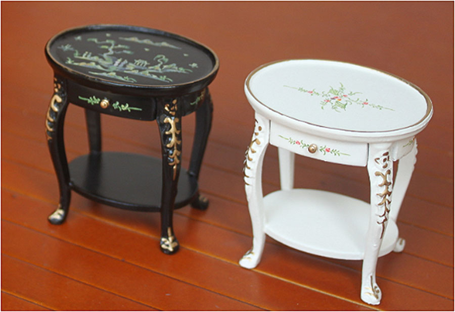 Овальные столики для кукол  для оформления тематических румбоксов или кукольных домиков со стилизацей под рококо или дворцовый стиль. Миниатюрная мебель выполнена из дерева, окрашена с элементами золочения и тончайшей ручной росписью.