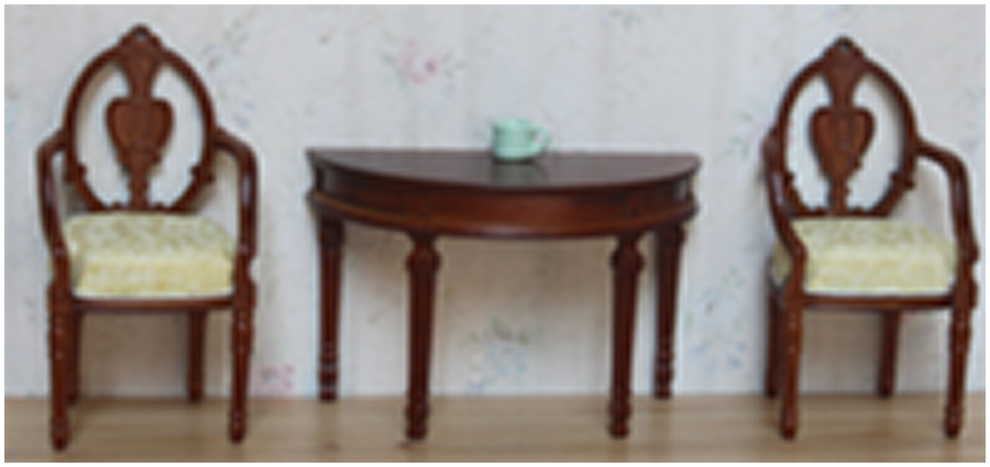 Миниатюрная мебель выполнена из дерева, цвет орех, обивка стульев - ткань. Такая деревянная мебель с богатой отделкой подойдет для оформления румбокса или кукольного домика.