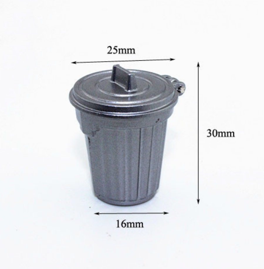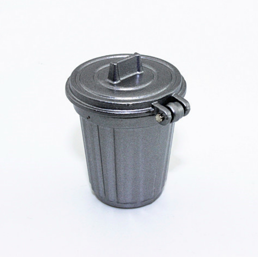 Устойчивый металлический мусорный бак с крышкой можно поставить и в кукольный домик и во дворе.