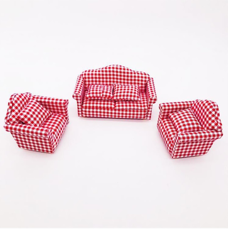 Набор мягкой мебели для кукол классической расцветки в красно-белую клетку размером около 12 см (масштаб 1:12) - диван и два кресла с подушками. Такая миниатюрная мебель подойдет для кукольного дома или румбокса