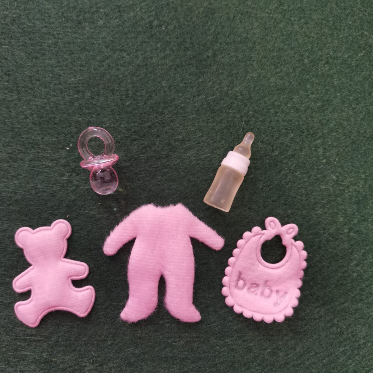 Миниатюрные вещички для кукольных деток. В набор входит слюнявчик, комбинезон, мишка, соска, бутылочка с водой - есть розовый вариант для девочки и голубой для мальчика.