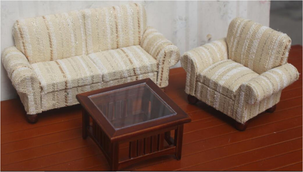 Набор миниатюрной мебели для кукольной гостиной : диван, кресло, журнальный столик. Такая мебель подойдет для оформления современных интерьеров в кукольных домиках и румбоксов масштабом 1:12 (для куколок высотой около 12 см)