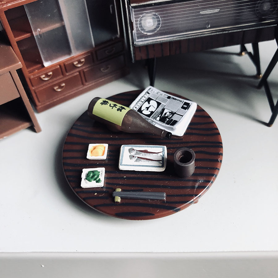 В набор входит шкафчик, круглый журнальный столик (диам. 4,5см) с набором суши, бутылочкой (2,5 м) саке и стаканчиком, телевизор на подставке (высота 4,3 см), тумбочка с телефоном, проигрыватель (длина 5,1 см), швейная машинка на подставке с табуреткой.