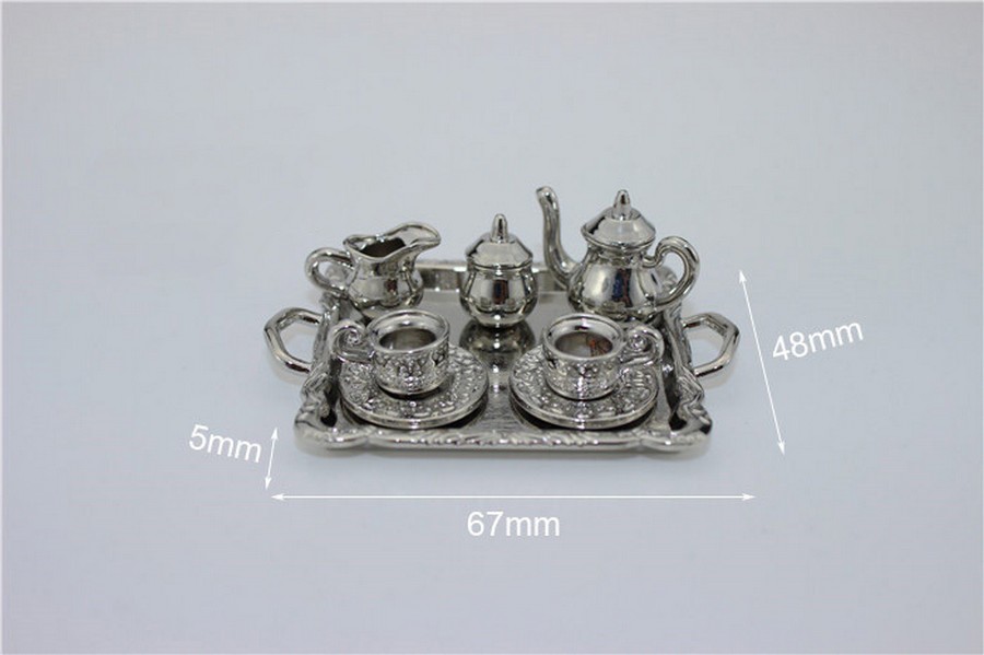 Красивый нарядный набор металлической посуды на подносе с элементами "чеканки". Подойдет для интерьеров в кукольных домиках масштабом 1:12 в качестве чайного сервиза или кофейного сервиза в домиках 1:6