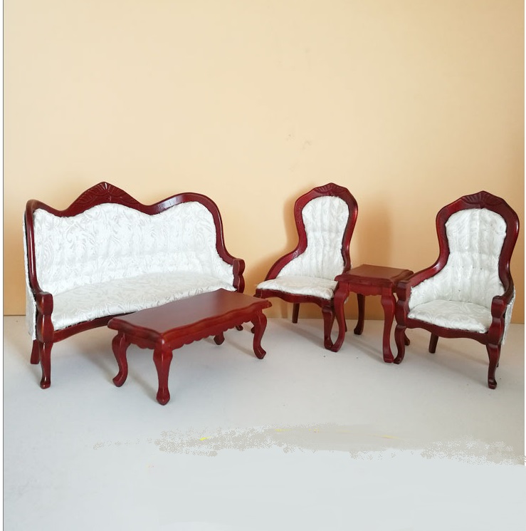 Комплект мягкой мебели для кукольного холла, гостиной или кабинета - диван, два кресла, прямоугольный журнальный столик и квадратный столик-подставка