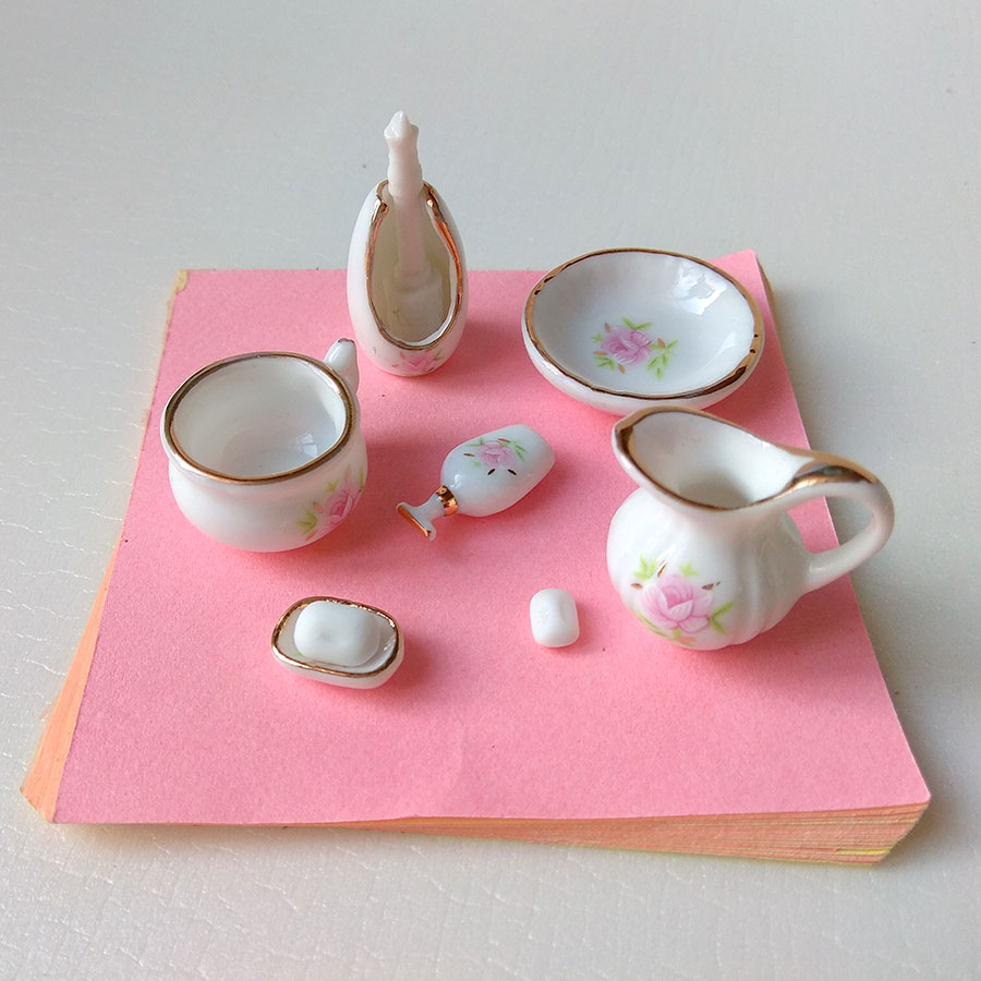 Набор фарфоровых туалетных принадлежностей для кукол (размер около 12 см). В наборе - кувшин и тазик, мыльница с мылом, флакончик для парфюма, ночной горшок, ершик на подставке - все самое необходимое для комплектации ванной комнаты для куклы в стиле ретро.
