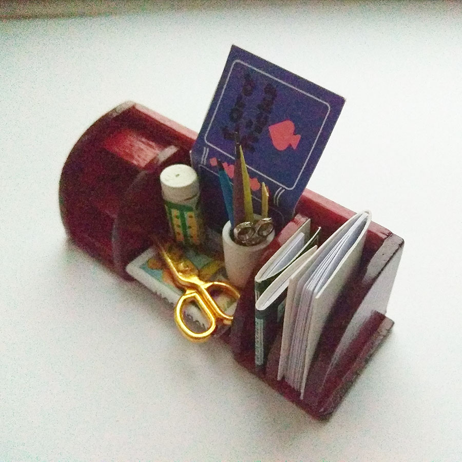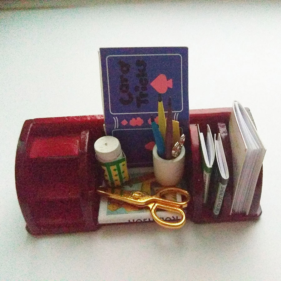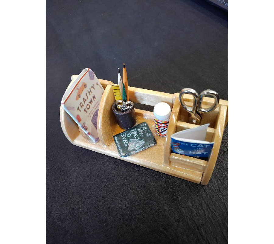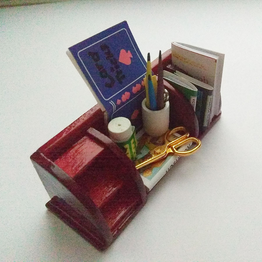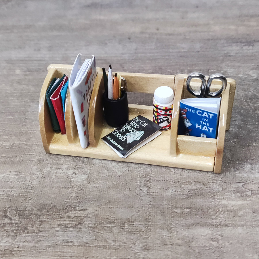 Миниатюрная деревянная полка с самыми разными канцелярскими принадлежностями для румбокса или кукольного домика