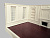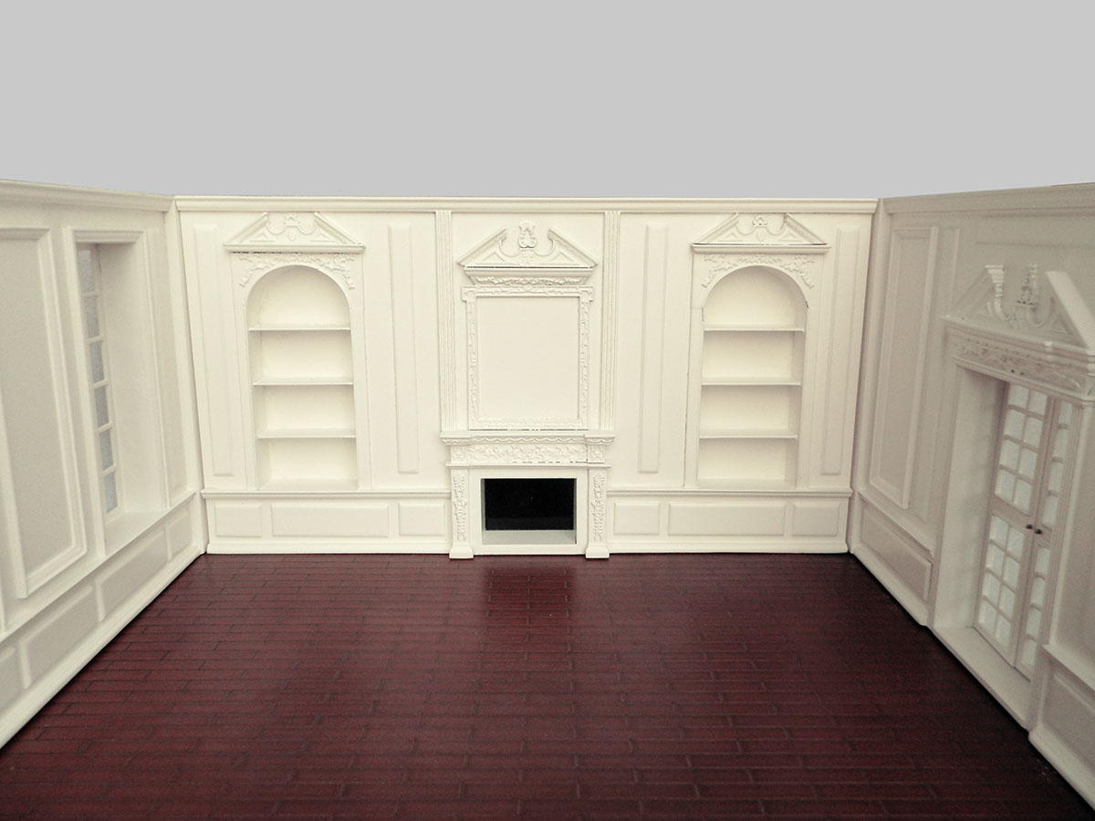 Центральная панель со встроенными полками и камином. Боковые панели: слева - с двумя застекленными окнами, справа – с застекленной входной дверью. Пол коричневый, глянцевый, ламинат с рифлением под паркет.