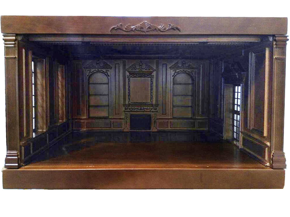Центральная панель со встроенными полками и камином. Боковые панели: слева - с двумя застекленными окнами, справа – с застекленной входной дверью. Пол коричневый, глянцевый, с рифлением под паркет. Потолок также украшен резьбой.