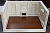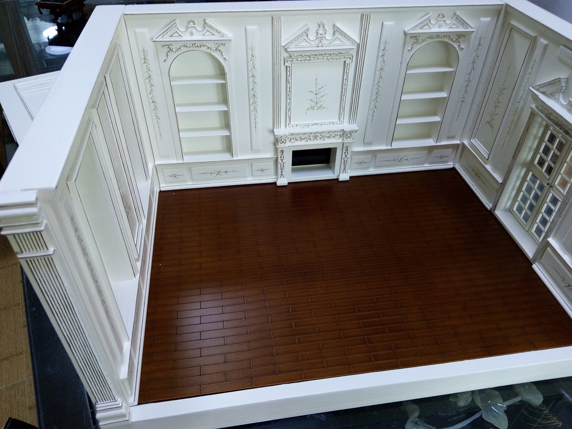 Центральная панель со встроенными полками и камином. Боковые панели: слева - с двумя застекленными окнами, справа – с застекленной входной дверью. Пол коричневый, глянцевый, ламинат с рифлением под паркет. Белый лепной потолок также расписан и украшен резьбой.