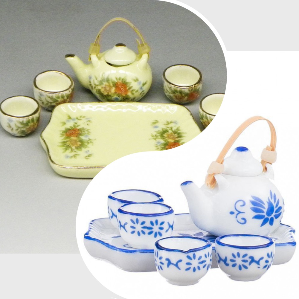 В набор входят 4 пиалы, чайник и подносик. Миниатюра кукольная для домиков и румбоксов масштабом 1:12