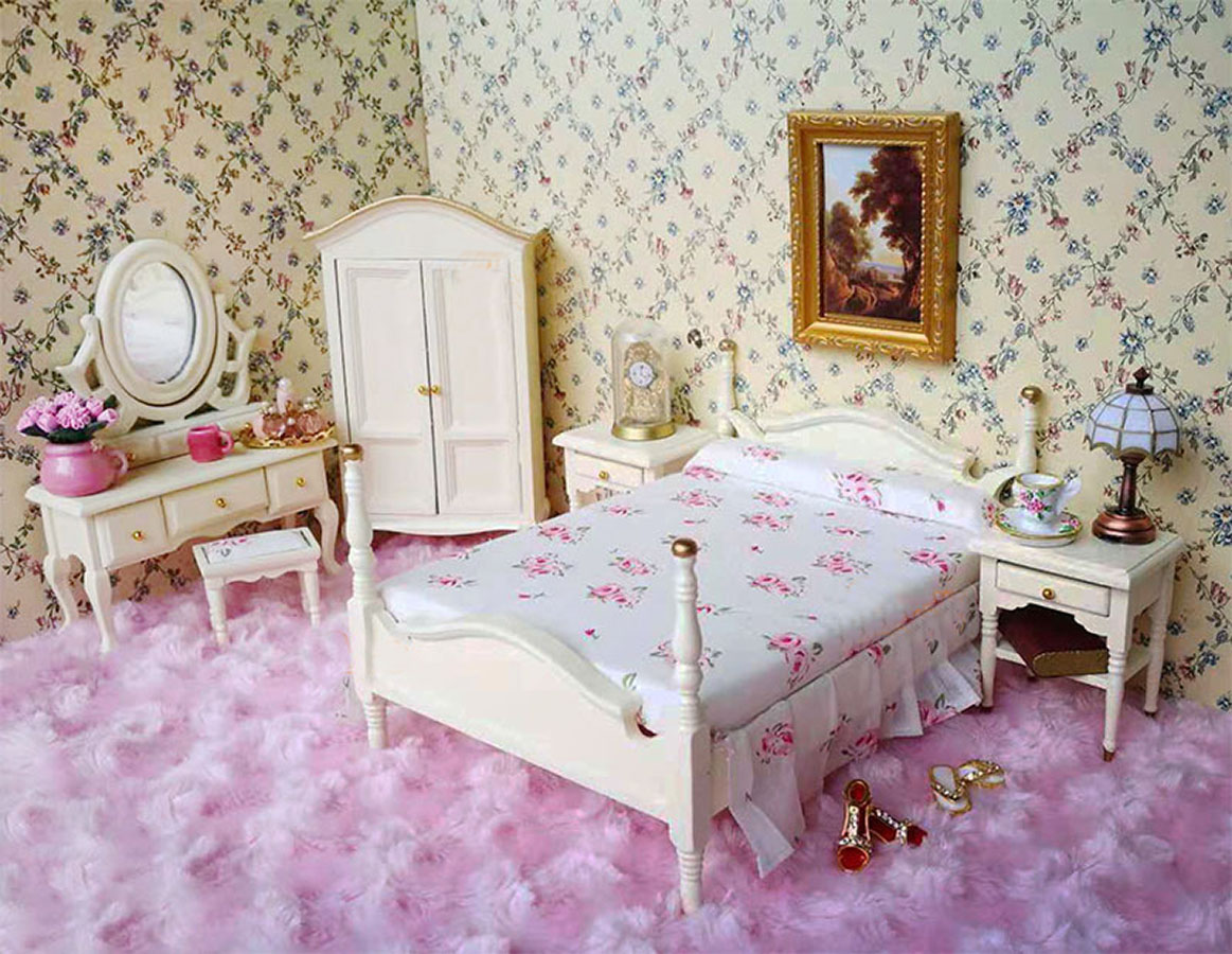 Спальный гарнитур из 6 предметов для оформления кукольного домика или румбокса.