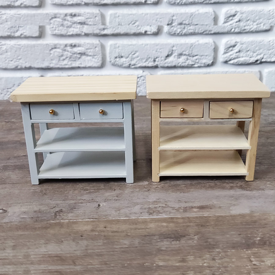 Аккуратный миниатюрный кухонный столик для кукол с двумя выдвигающимися ящичками и открытыми полками внизу. Такая кукольная мебель впишется в кухню, ванную комнату и другие кухонные помещения в домике или румбоксе.