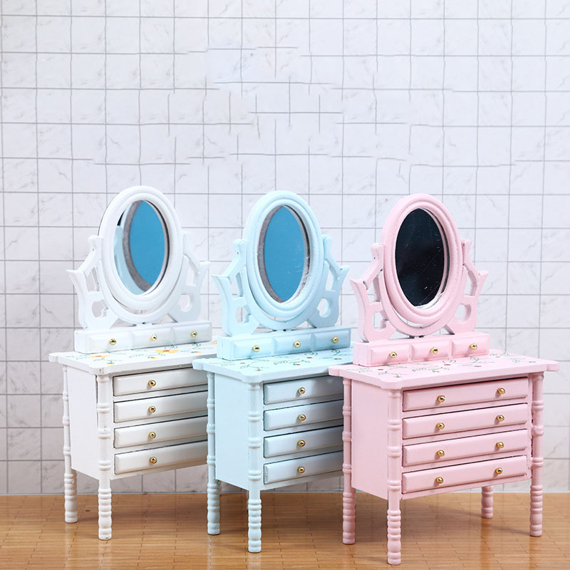 Кукольная миниатюра - изящный туалетный столик с овальным зеркалом и рисунком на столешнице.