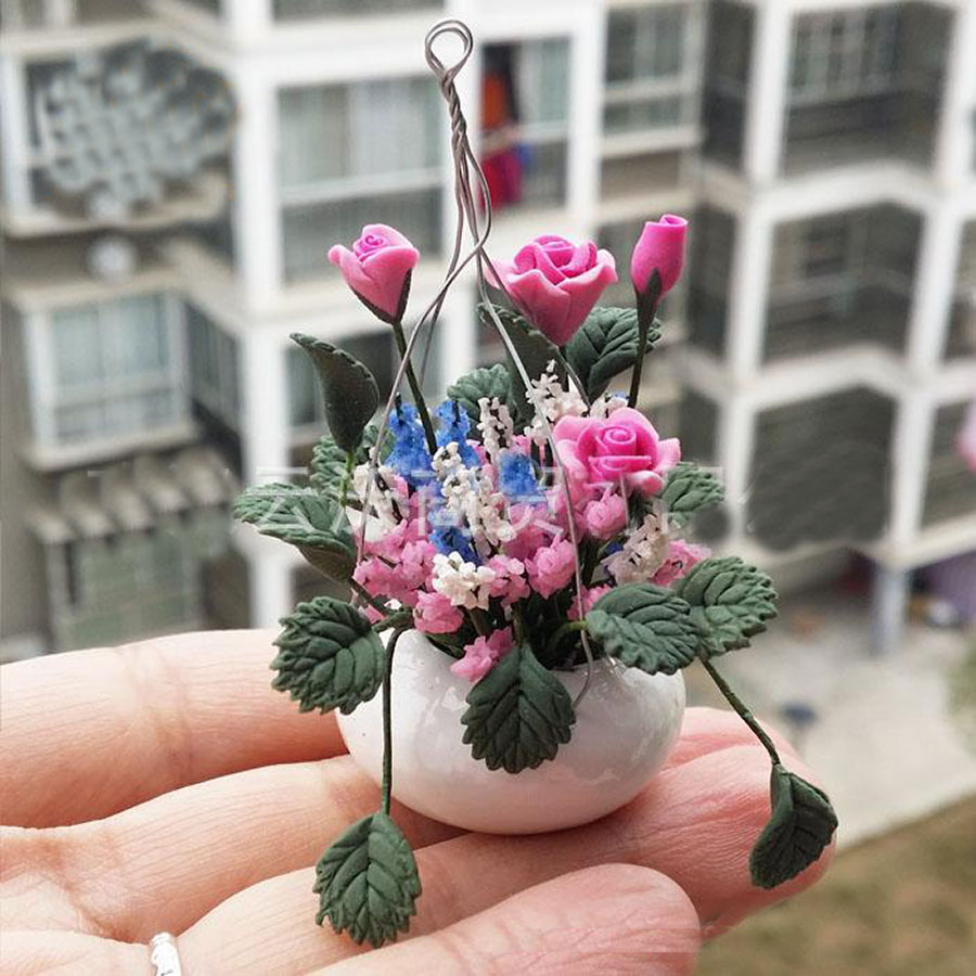 Цветы в подвесном кашпо для кукольного дома 1:12