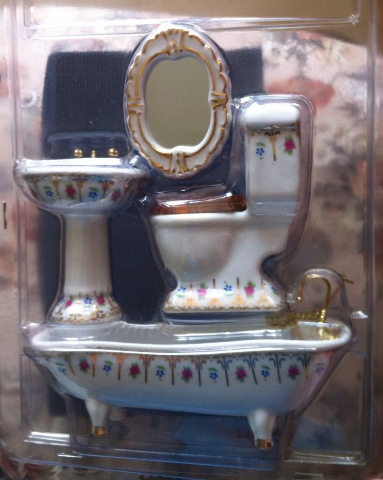 В наборе - самое необходимое для комплектации ванной комнаты для куклы: фаянсовая ванна с золотыми кранами и цепочкой с заглушкой, раковина, унитаз с деревянной крышкой, ёршик в подставке и зеркало.