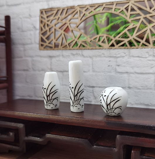 Набор миниатюрных фарфоровых ваз белого цвета с минималистичным орнаментом для оформления кукольного домика или румбокса