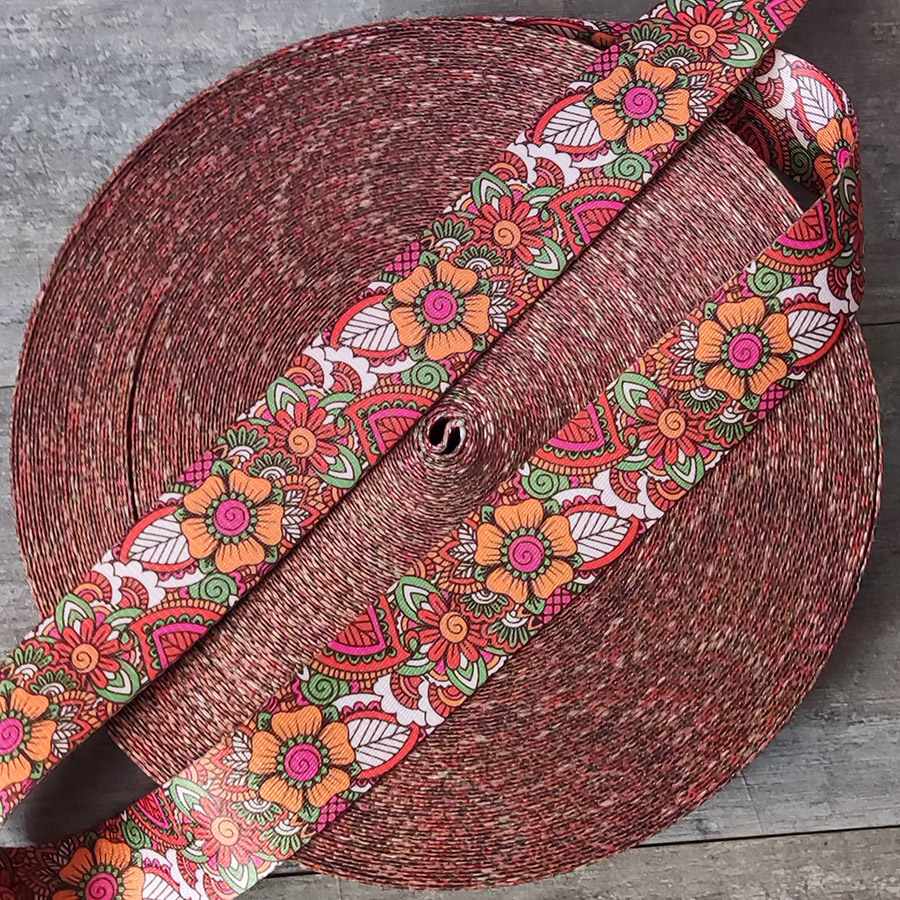 Плотная ременная лента из синтетических волокон.  Пестрый насыщенный цветочный орнамент в красно-оранжевой гамме.  Оригинальное цветовое сочетание ленты украсит ваше изделие.