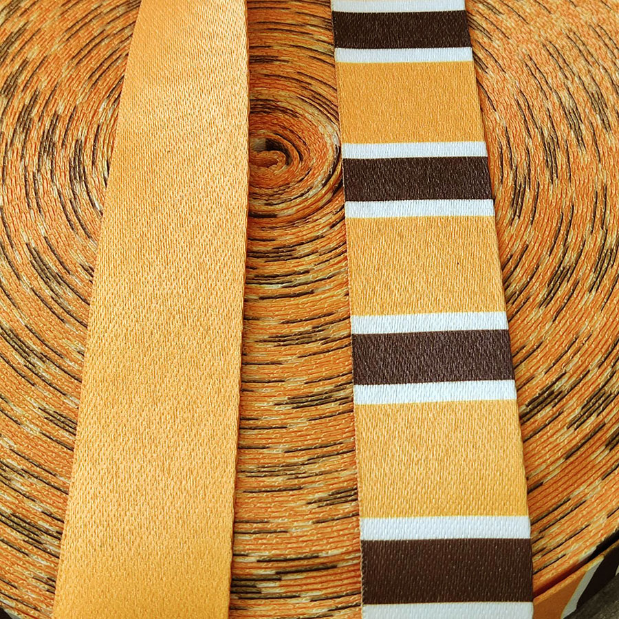 Плотная ременная лента из синтетических волокон.  Цвет яркий желток, оранжевый с полосками кориченевого цвета.  Оригинальное цветовое сочетание ленты украсит ваше изделие.