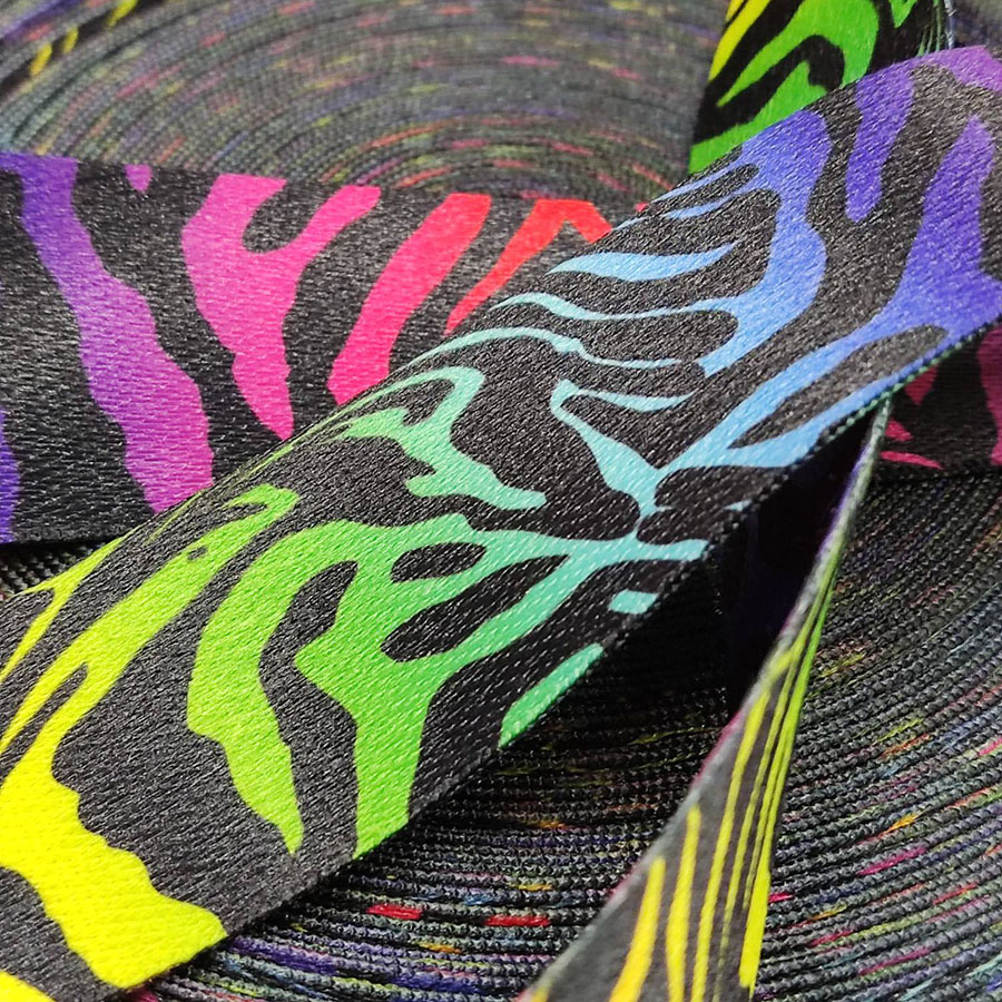 Плотная ременная лента из синтетических волокон.  Орнамент под зебру на радужном фоне.  Оригинальное цветовое сочетание ленты украсит ваше изделие.