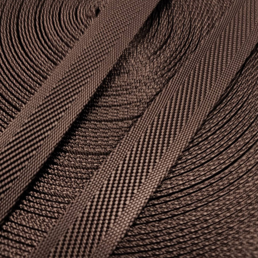Плотная ременная текстильная лента из полиэстера коричневого цвета с интересным рельефом в виде орнамента из косых полос