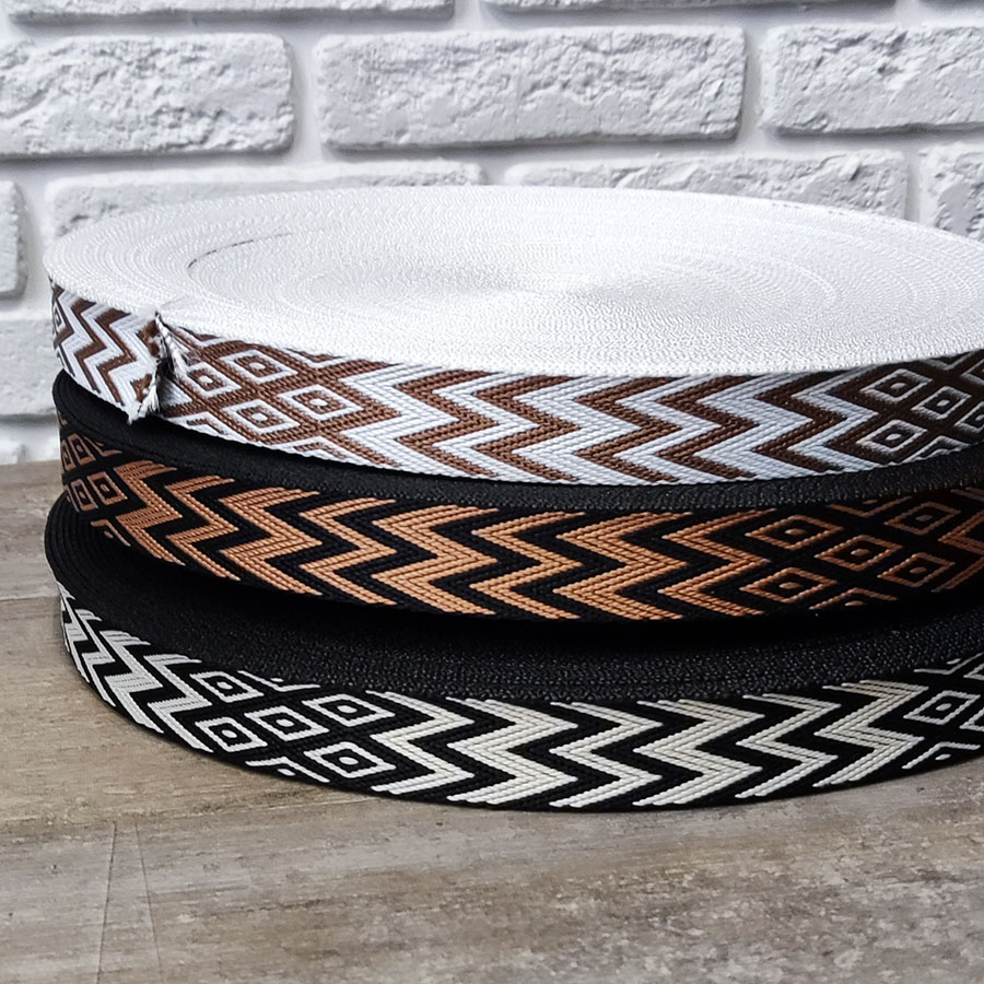 Плотная ременная лента из синтетических волокон с жаккардовым переплетением. Оригинальное переплетение, рельефность и приятное цветовое сочетание текстильной ленты украсит ваше изделие.