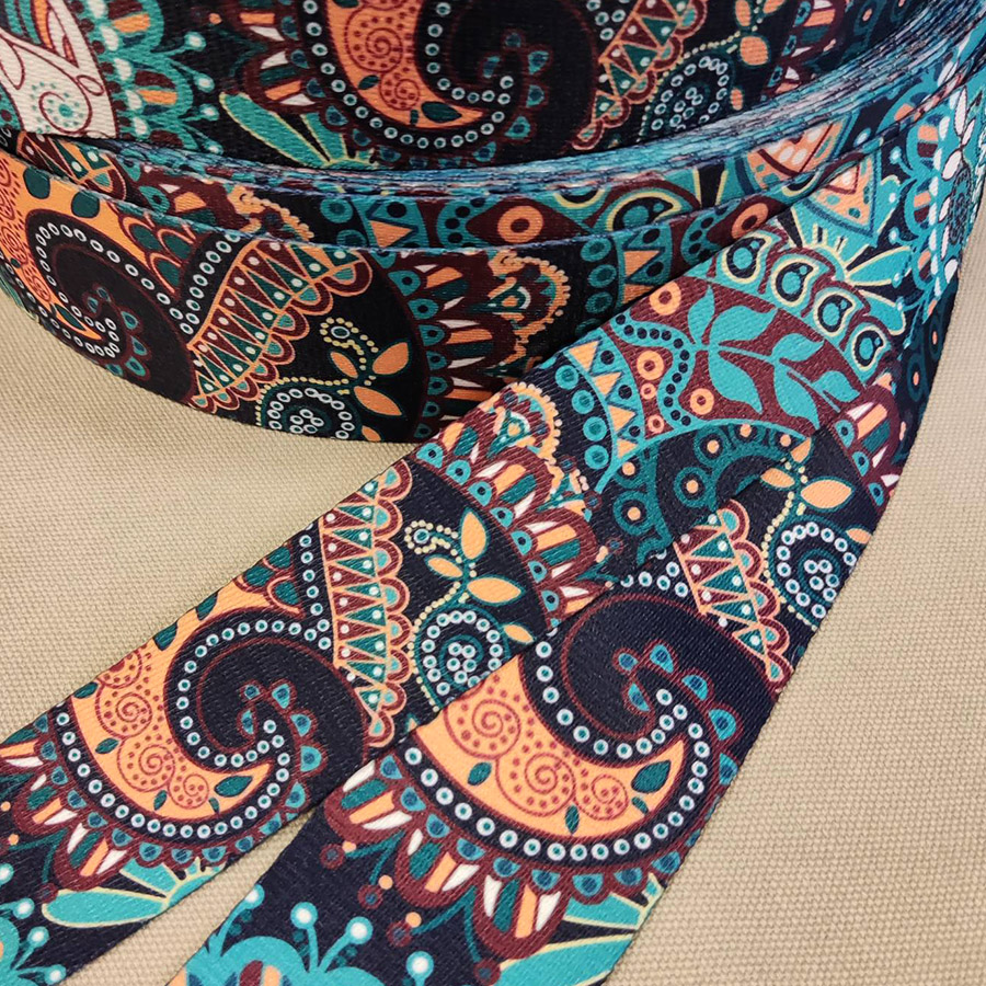 Стропа (ременная лента) из синтетических волокон. Ременная тесьма плотная, с ярким принтом в виде классического этно рисунка пейсли, в сине-голубой гамме.